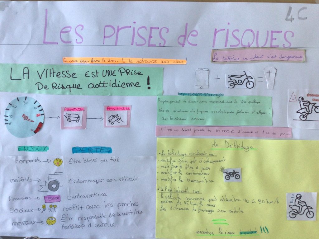 Dans le cadre du parcours citoyen, les élèves de 4ème ont participé à une sensibilisation à la sécurité routière le lundi 21 et mardi 22 novembre. Après de riches échanges avec l’intervenante du conseil départemental, chaque groupe d’élèves a pu réaliser et présenter une affiche sur un thème particulier : comportement à risques, 2 roues motorisés, alcool, vulnérabilité, drogues. Les affiches gagnantes de chaque classe peuvent être consultées sur le site suivant http://www.allerplusloin-securiteroutiere.fr/